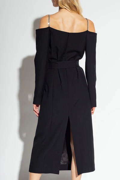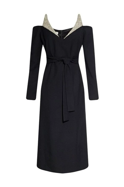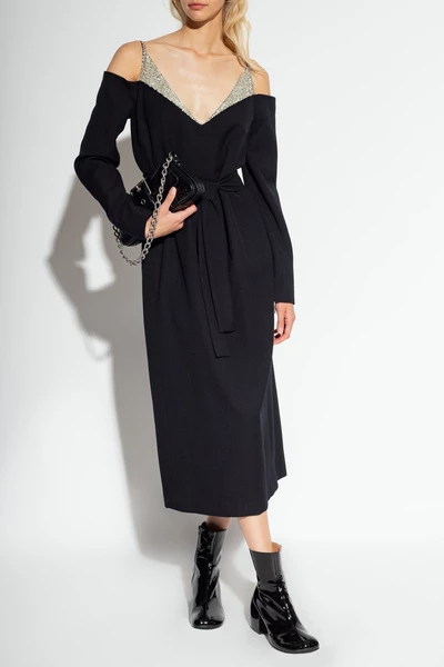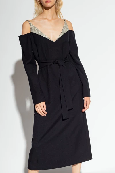 Zwarte jurk met riemen van Dries Van Noten. Gemaakt van een wol- en zijden blend, is dit ontwerp verfraaid met kristallen en compleet met een verborgen rugzip, taille stropdas, gleuf aan de achterkant en lange mouwen.