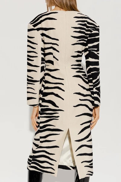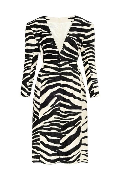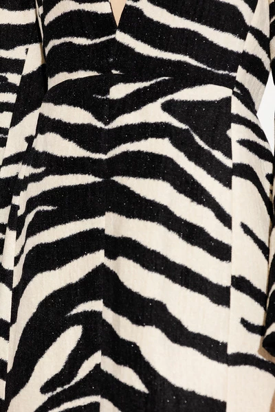 Zwart en roomjurk van Dries Van Noten. Versierd met een diermotief, deze stijl heeft een diepgaande V-neckline, een achterste rits met een haak en oogafsluiting, Lurex-garenafwerkingen, lange mouwen en een achtersplit.