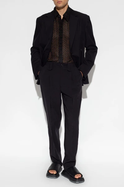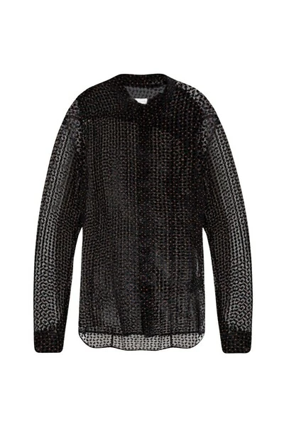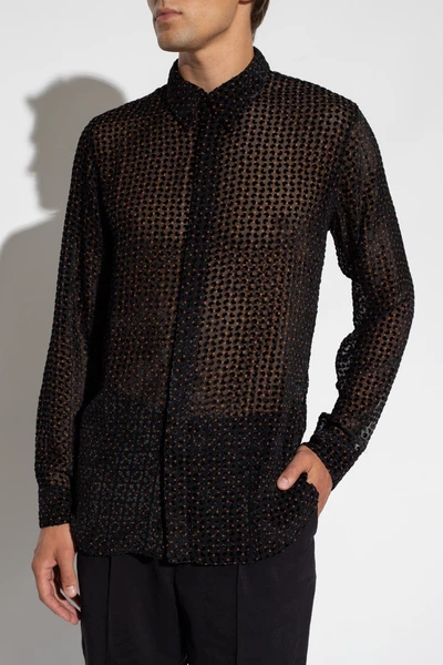 Zwart, transparant, gepast shirt van Dries Van Noten. Dit kledingstuk is bevestigd met knoppen met een verborgen placket, heeft een bruine stipprint, fluweel in zwart en lange mouwen met manchetten met knoop.