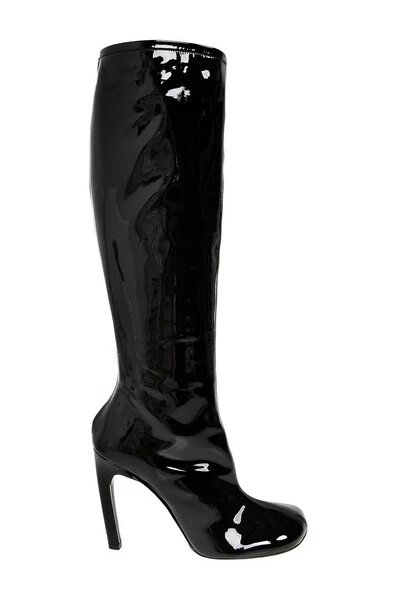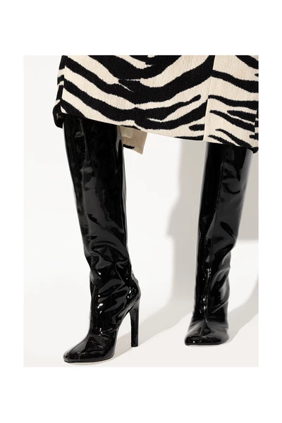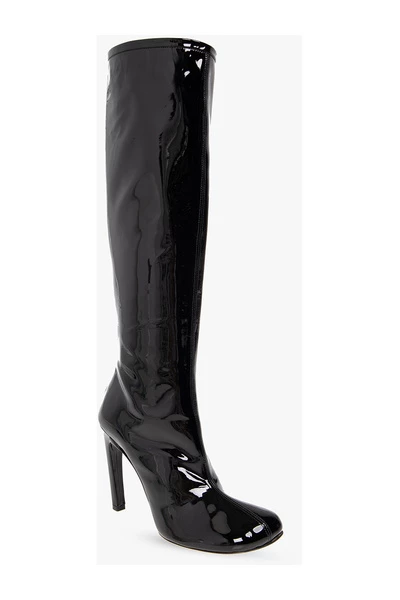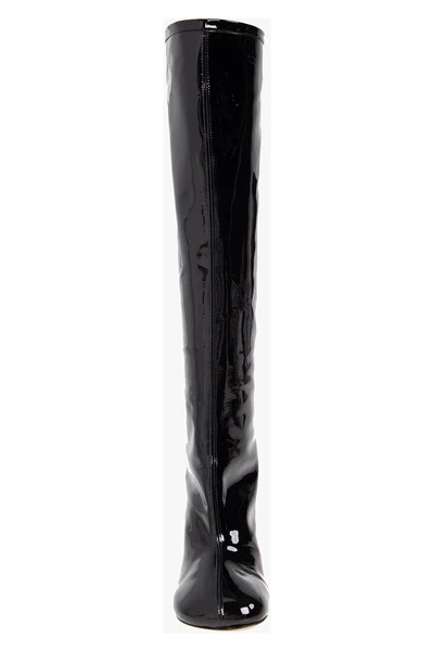 Zwarte hakken laarzen van Dries Van Noten. Gemaakt van patentleer, dit model bevindt zich op een zwarte en beige rubberen zool en heeft een ruglipper.