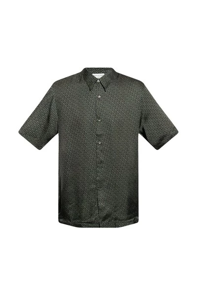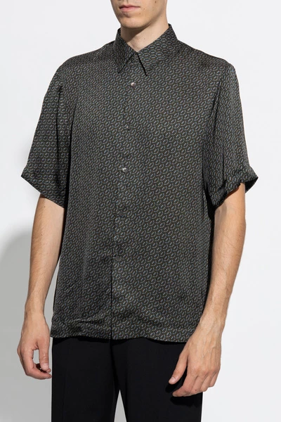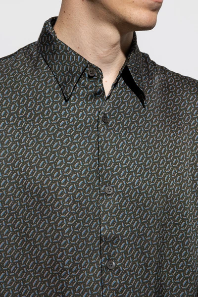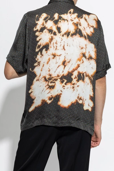 Zwart, blauw en beige shirt van Dries Van Noten. Dit ontwerp met korte mouwen is bevestigd met knoppen en heeft een geometrisch patroon en veelkleurige print aan de achterkant.