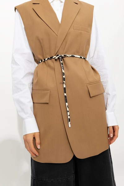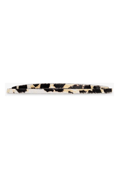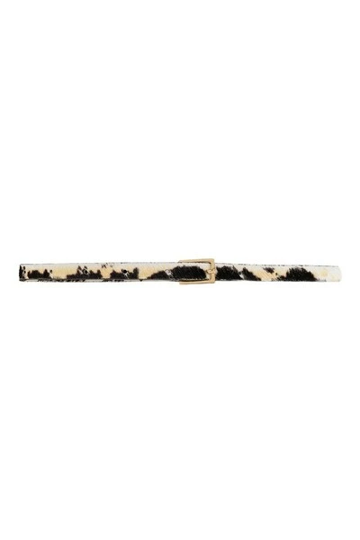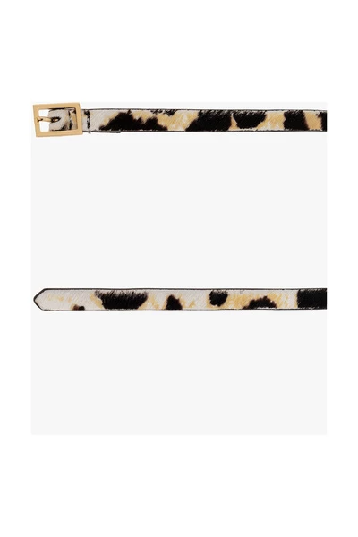 Wit, zwarte en gele riem van Dries Van Noten. Gemaakt van leer met een haarafwerking, dit item toont een bloemenpatroon en een goudkleurige metalen gesp.