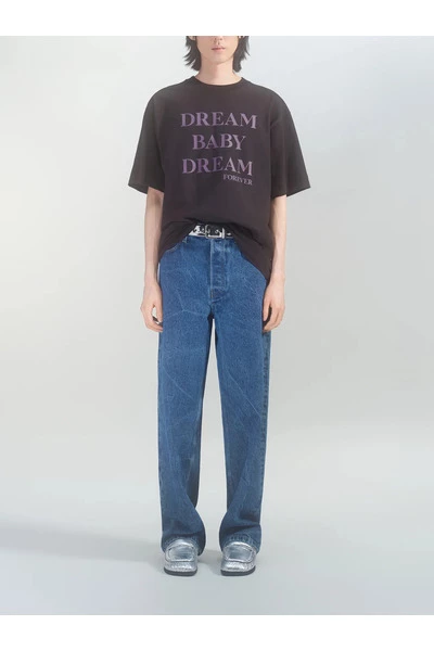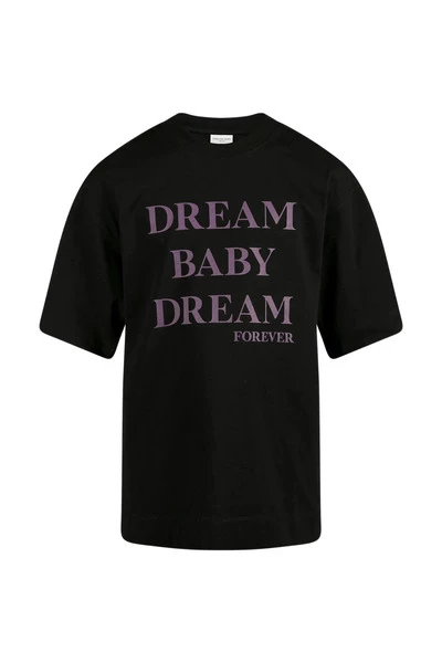 Zwart loszittende T-shirt van Dries Van Noten. Gemaakt van katoen, dit ontwerp met korte mouwen heeft een geribbelde crewneck en toont een paarse ‘Dream Baby Dream’ print op basis van een nummer van de Suicide van de band.
