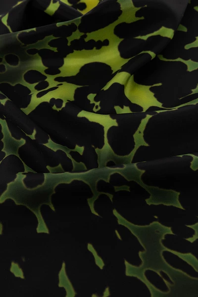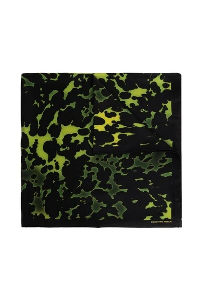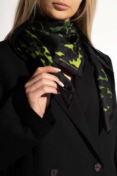 Zwarte sjaal van Dries Van Noten. Gemaakt van zijde toont dit item een ​​bedrukt groen patroon en logo.