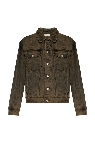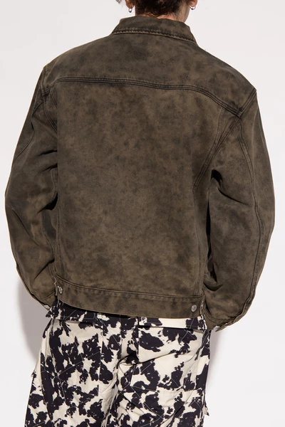 Khaki denim jas van Dries Van Noten. Deze stijl is vervaardigd met een vintage effect en heeft knoopbevestigingen, twee laszakken, twee geklauwde zakken met knoppen en lange mouwen met knopmanchetten.